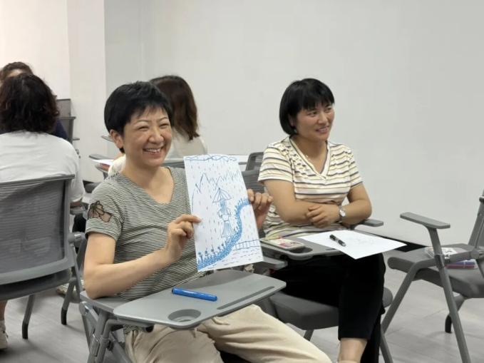 喬老師引導大家從“雨的樣貌”“人的狀態(tài)”“應(yīng)對資源”三個角度,觀察自己的壓力來源與內(nèi)在力量。隨后,家長們在小組中真誠分享畫作背后的情緒與故事,彼此傾聽、相互支持,在團體中獲得共鳴與力量。
