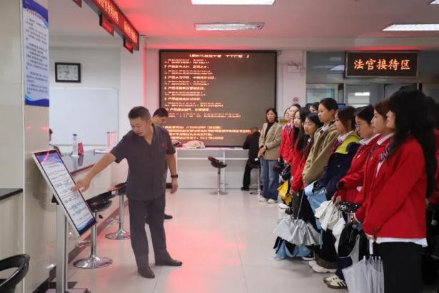 走進(jìn)訴訟調(diào)解對(duì)接中心,學(xué)生們積極向調(diào)解員提問(wèn);進(jìn)入審判法庭,法徽高懸、法槌醒目,講解員介紹了審判席、原被告席、旁聽席等組成部分,重點(diǎn)講解了法庭內(nèi)智能化設(shè)備的功能。每到一處,講解員都詳細(xì)解讀各部門職能分工、工作流程及干警日常工作情況。不少學(xué)生眼中閃爍著光芒,充滿了對(duì)法律職業(yè)的憧憬。