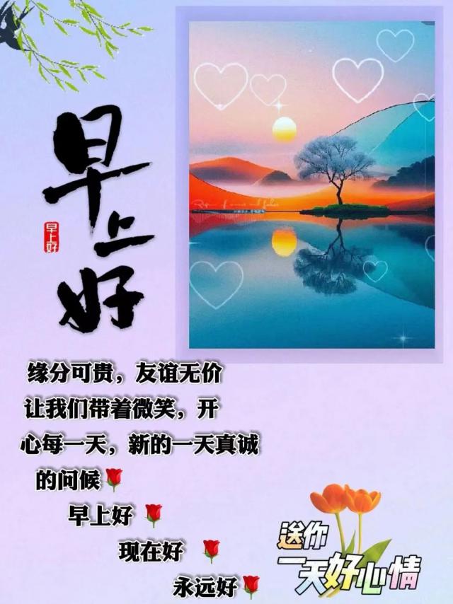 清晨陽光最燦爛,開啟一天好心情;清晨空氣最新鮮,強(qiáng)健一天好身體;清晨花兒最迷人,帶來一天好運(yùn)氣。早上好,朋友,愿你快樂一整天!