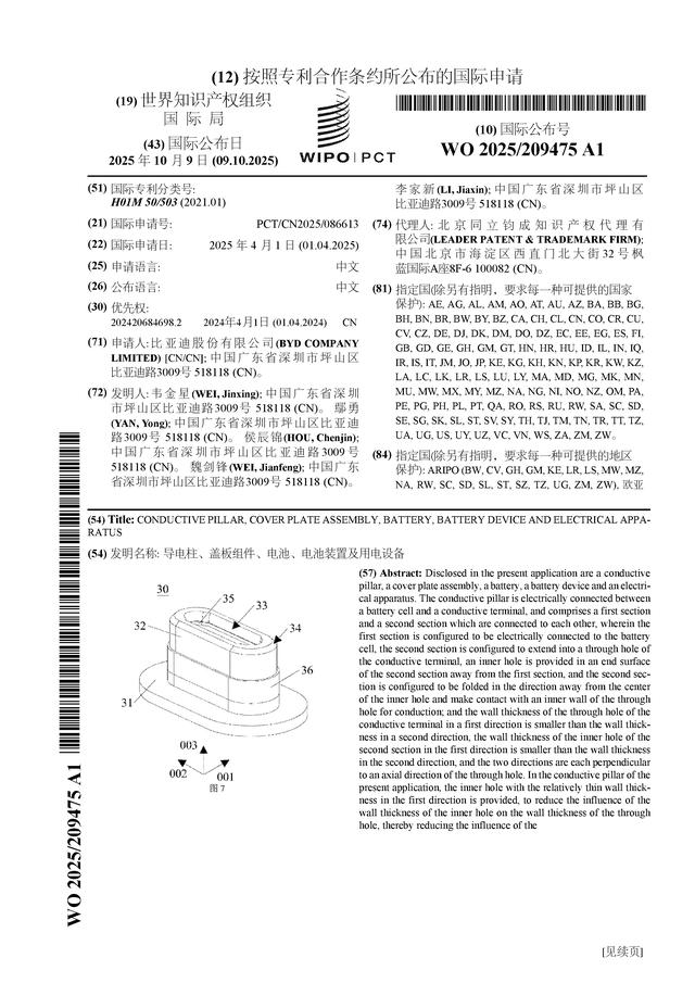 比亞迪公布“導電柱等相關(guān)”國際專利申請