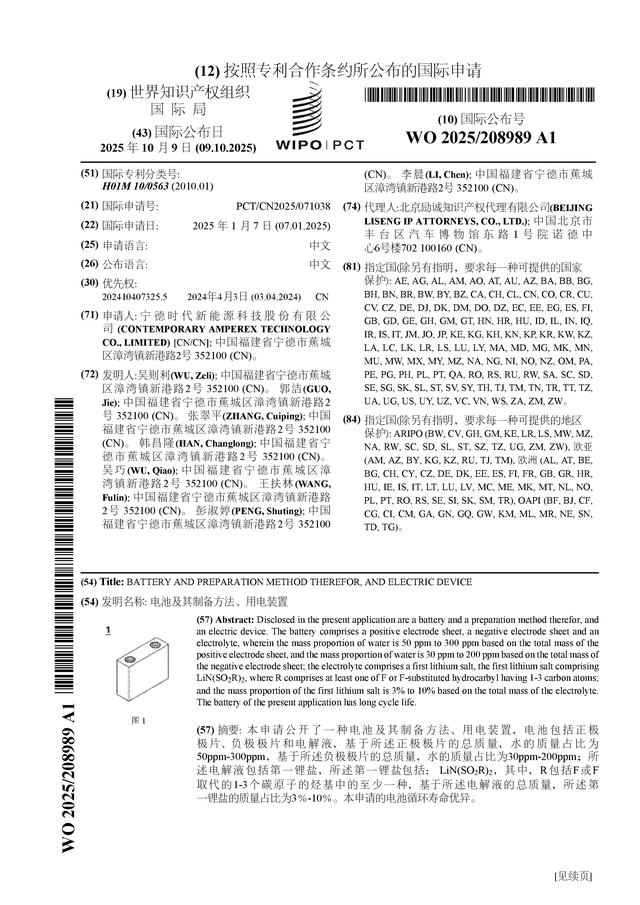 寧德時代公布“電池及其制備方法、用電裝置”國際專利申請