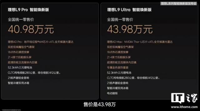 續(xù)航方面,理想L9智能煥新版Pro和Ultra版的CLTC純電續(xù)航均為280公里,綜合續(xù)航達1412公里。