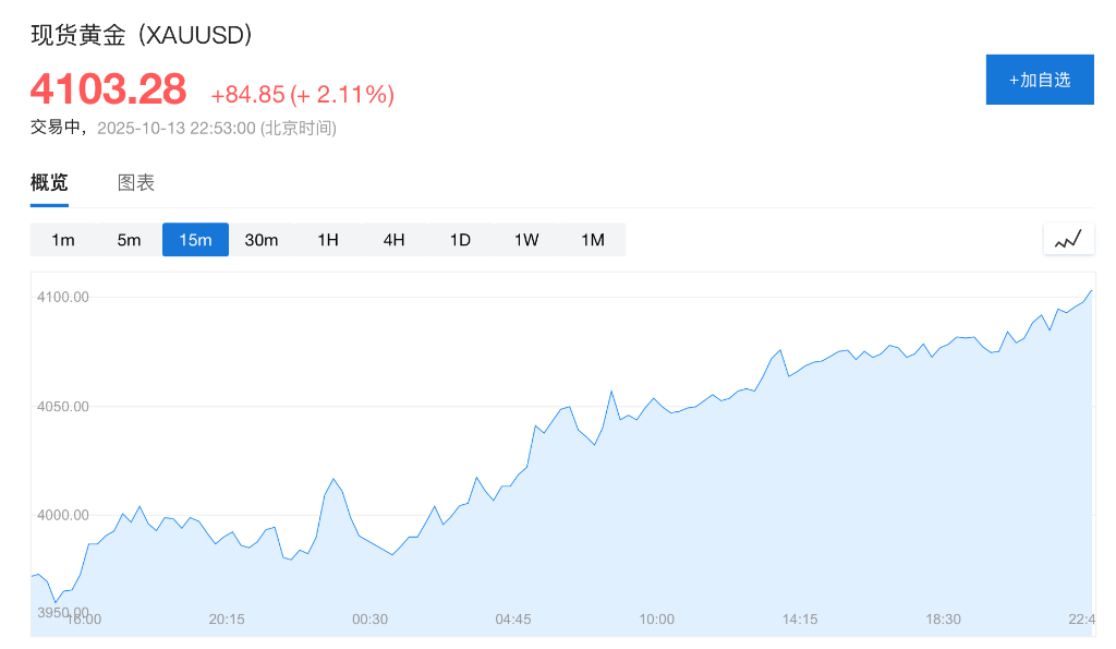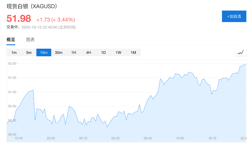現(xiàn)貨黃金日內(nèi)漲幅超2.1%,突破4100美元/盎司,再創(chuàng)歷史新高。與此同時,白銀市場價格波動更為劇烈,現(xiàn)貨白銀一度突破52美元/盎司,再創(chuàng)歷史紀錄新高,日內(nèi)一度超漲4%。
