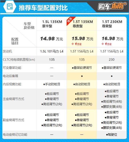 再花1萬元升級到1.5T 230KM尊榮型,核心提升是CLTC純電續(xù)航里程增加。對多數(shù)消費(fèi)者日常通勤來說,實(shí)際意義不大。配置上只增加主/副駕腰部支撐調(diào)節(jié)和駕駛位記憶等舒適性功能,整體性價(jià)比一般。