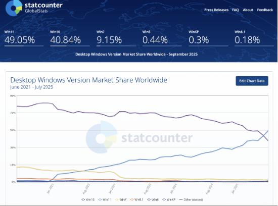盡管如此,根據(jù)Statcounter數(shù)據(jù)顯示,截至目前,全球仍有40.84%的用戶在使用Win10,而使用Win11的用戶占比為49.05%。若按照微軟官方7月披露的全球14億Windows用戶數(shù)量計算,意味著全球仍有約5.7億Windows用戶停留在Win10。