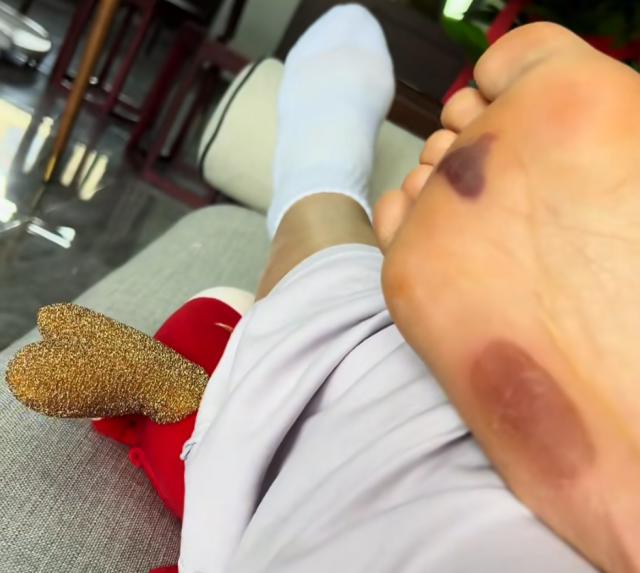 薛女士稱,剛開始10多分鐘感覺效果還不錯,到15分鐘時疼痛加劇,但她以為“痛則不通”,便忍痛堅持到20分鐘,結(jié)果腳底板突然噴血,發(fā)現(xiàn)有大面積血泡,有的已被磨破。