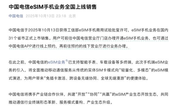 快科技10月14日消息,繼中國聯(lián)通和中國移動之后,中國電信昨晚壓軸宣布,于2025年10月13日獲得工信部eSIM手機商用試驗批復(fù)許可,eSIM手機業(yè)務(wù)在國內(nèi)31個省市正式上市銷售。