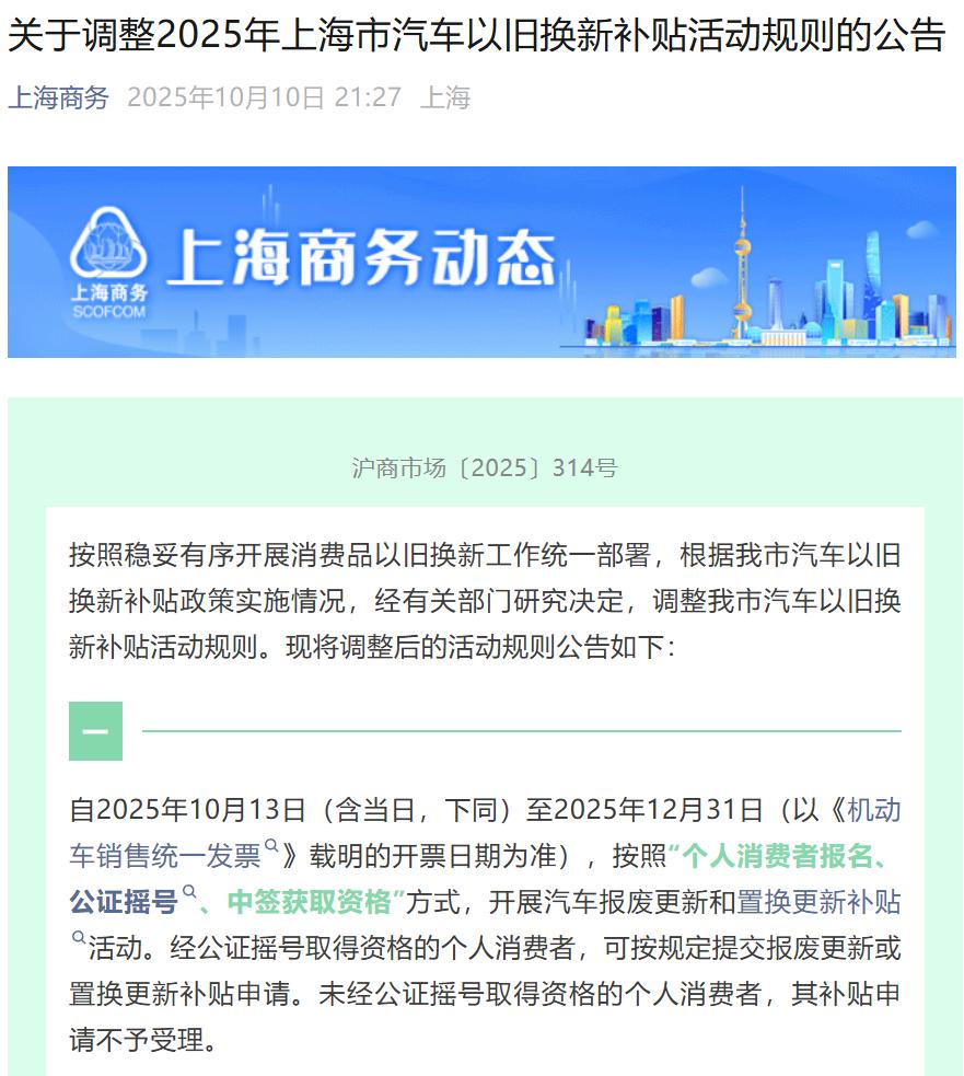 上海商務(wù),關(guān)于調(diào)整2025年上海市汽車以舊換新補(bǔ)貼活動規(guī)則的公告