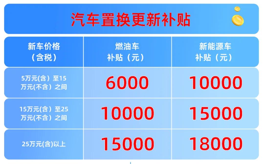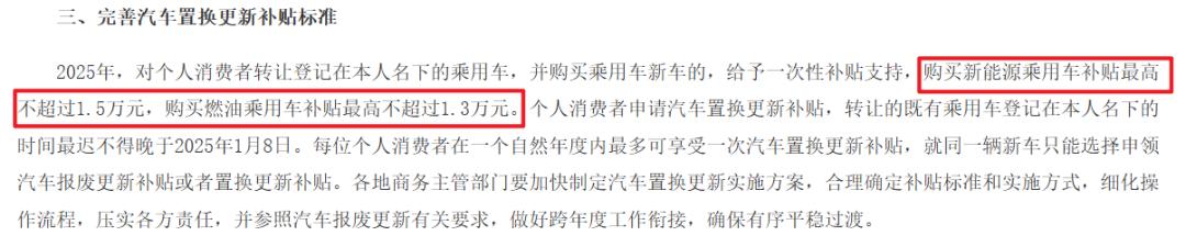 根據(jù)《商務(wù)部等8部門辦公廳關(guān)于做好2025年汽車以舊換新工作的通知》,置換補(bǔ)貼換新能源最高補(bǔ)1.5萬,換油車最高補(bǔ)1.3萬。