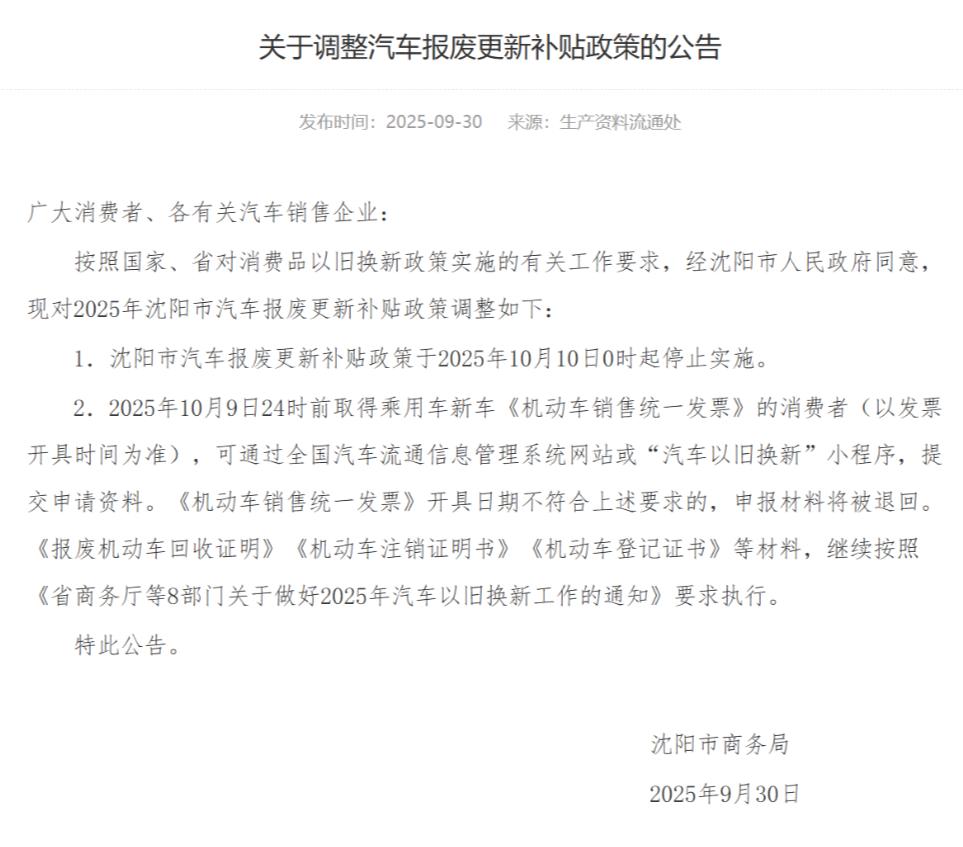 幾乎同時,沈陽宣布10月10日停止報廢補(bǔ)貼。它是全國主要城市中首個明確停止報廢補(bǔ)貼的。