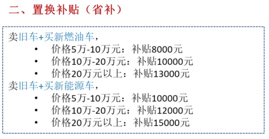 還增加了置換補(bǔ)貼。即舊車不一定要報廢,轉(zhuǎn)讓出去也能拿補(bǔ)貼。