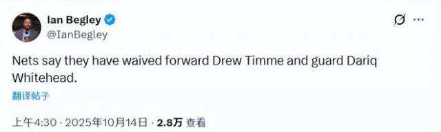 北京時間10月14日,籃網(wǎng)隊官方宣布,已裁掉達里克 - 懷特黑德和德魯 - 蒂米,球隊還在社媒上對兩人表示了感謝。