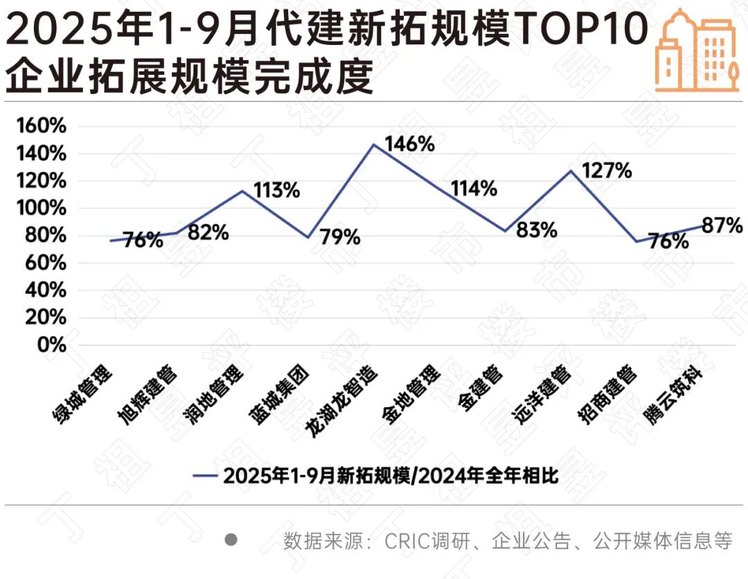 CRIC調(diào)研數(shù)據(jù)表明,前三季度超半數(shù)代建企業(yè)新拓面積同比上漲,延續(xù)了2025年以來的增速回暖態(tài)勢。尤其是TOP10企業(yè)幾乎全部實現(xiàn)正增長,且漲幅領(lǐng)先。潤地管理、龍湖龍智造、遠洋集團等漲幅超過80%。