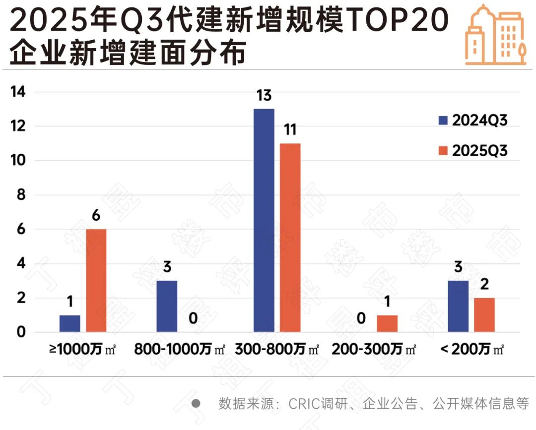 2025年以來,頭部代建企業(yè)擴張意愿強烈,拓展規(guī)模顯著提升。CRIC調(diào)研數(shù)據(jù)顯示,前三季度代建新增規(guī)模TOP20企業(yè)新增簽約建面為15771萬平方米,同比增幅31%。其中,綠城管理、旭輝建管、潤地管理、藍城集團、龍湖龍智造、金地管理6家企業(yè)新增代建規(guī)模超1000萬平方米。