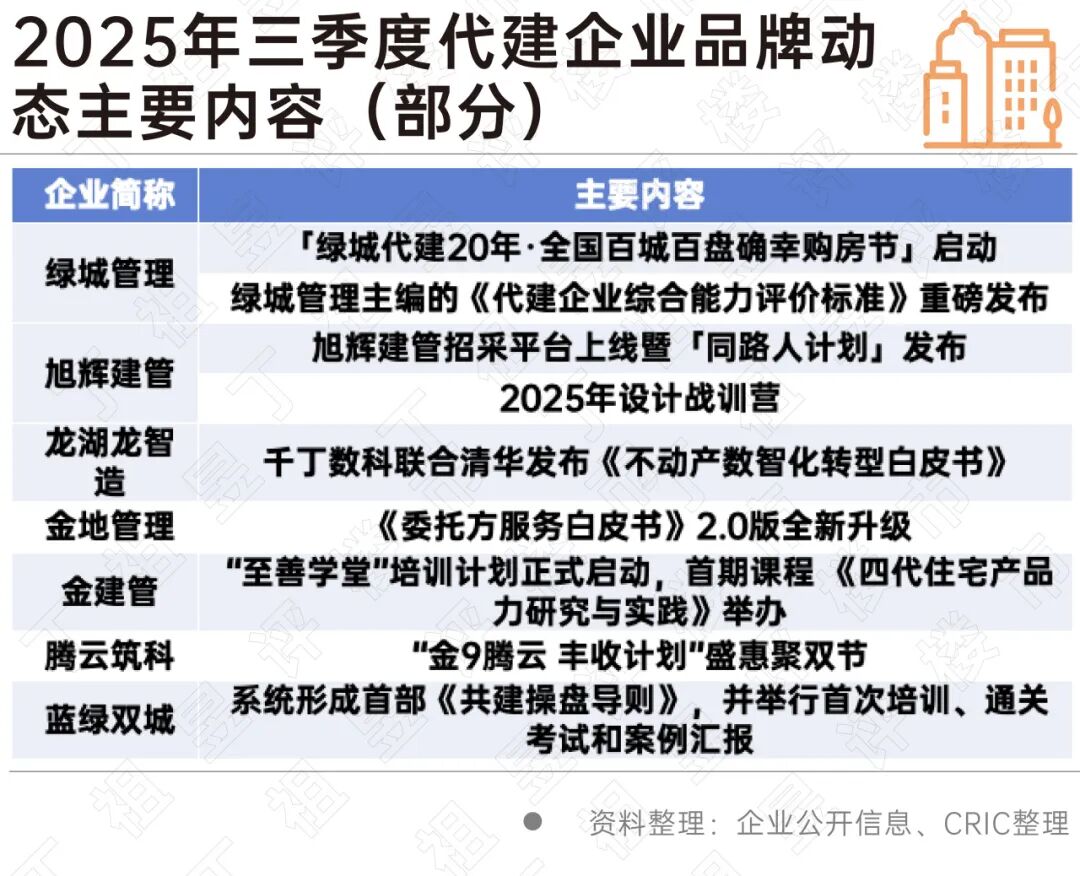在拓展業(yè)務(wù)視野的同時,代建企業(yè)還需提升自身競爭力。2025年三季度,代建企業(yè)通過傳統(tǒng)媒體、行業(yè)媒體、企業(yè)官網(wǎng)及官微等多渠道宣傳,形成全方位傳播矩陣,提高品牌知名度和市場關(guān)注度。頭部代建企業(yè)如綠城管理、旭輝建管、金地管理、龍湖龍制造等在品牌傳播方面表現(xiàn)出色,品牌傳播力領(lǐng)先。