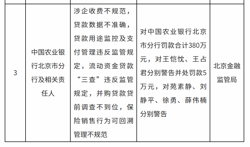 銀行觀察 | 農(nóng)行北京分行因六項違規(guī)被罰款380萬元