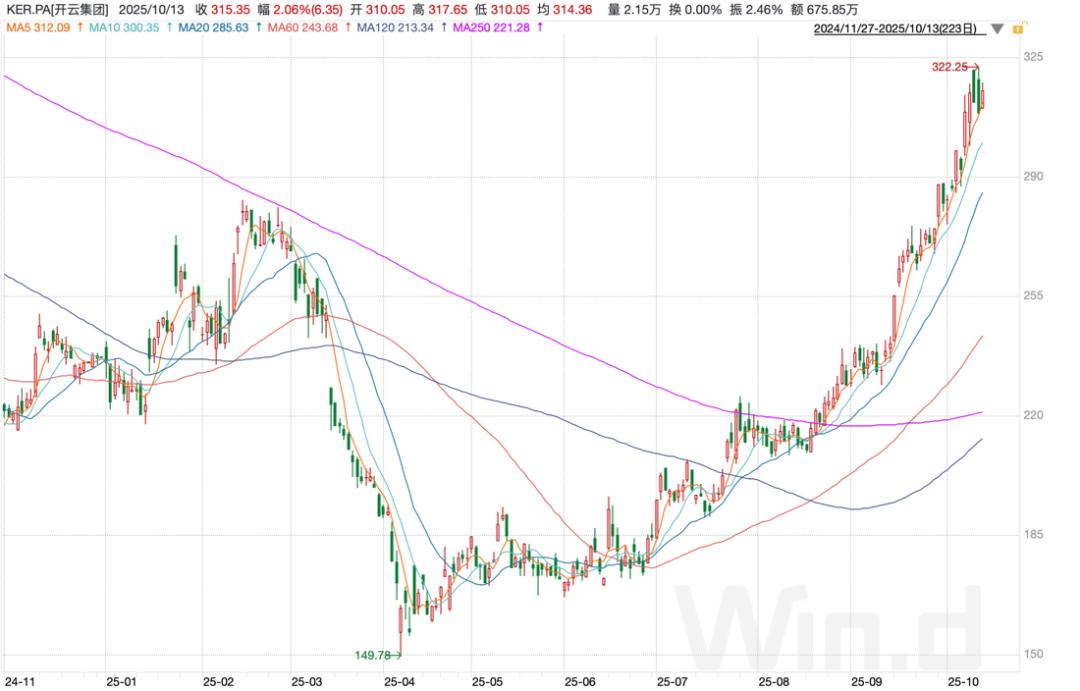 進(jìn)入今年二季度后,著名奢侈品品牌Gucci的母公司,法國(guó)開云集團(tuán)(以下簡(jiǎn)稱:開云)的股價(jià)持續(xù)暴漲,從4月7日至10月13日,區(qū)間漲幅超過(guò)了82%,并在同期的法國(guó)CAC40指數(shù)成分股中領(lǐng)漲。此前,開云的股價(jià)從2021Q3到2025Q1這三年多時(shí)間里,一直震蕩下行,期間股價(jià)跌去約80%。