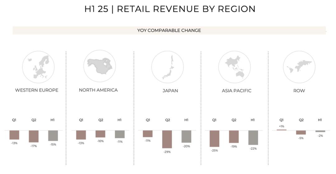 截至今年上半年,開云收入占比前三大區(qū)域是西歐、亞太和北美,三者合計(jì)約占公司收入的82%。參考前兩季度各區(qū)域收入可比口徑下的邊際變化,西歐收入占比與亞太持平,但受旅游業(yè)疲軟拖累,Q2收入同比變差;亞太與北美收入同比在Q2有邊際好轉(zhuǎn),但負(fù)增長(zhǎng)程度仍較深。
