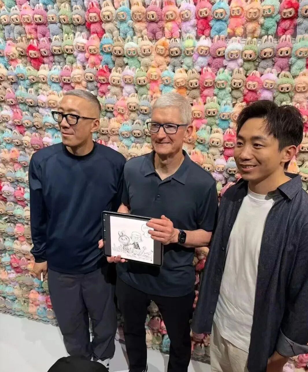科技博主Eva報(bào)道,在巡展期間,龍家升向庫(kù)克展示了他的創(chuàng)作靈感及不同的藝術(shù)作品,同時(shí)介紹了Labubu家族的創(chuàng)作背景。有趣的是,在滿墻的Labubu面前,藝術(shù)家龍家升展示了如何用iPad Pro進(jìn)行繪畫創(chuàng)作。