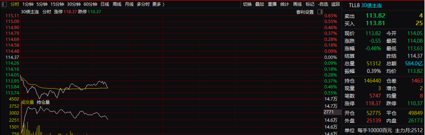 值得注意的是,當(dāng)天國債表現(xiàn)不強(qiáng)。30年期主力合約早盤一度下跌超0.6%。