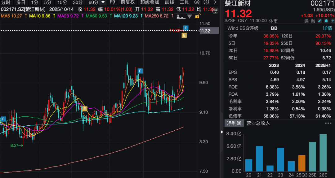 楚江新材今日公告,預(yù)計(jì)2025年前三季度實(shí)現(xiàn)歸屬于上市公司股東的凈利潤(rùn)為3.5億元—3.8億元,同比增長(zhǎng)2057.62%—2242.56%。
