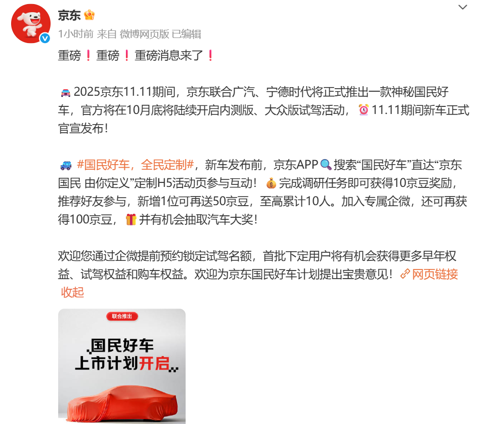 10月14日,京東官方微博發(fā)布消息,2025京東“11·11”期間,京東攜手廣汽、寧德時代將正式推出一款神秘“國民好車”,并會在10月底陸續(xù)開啟內(nèi)測版、大眾版試駕活動。
