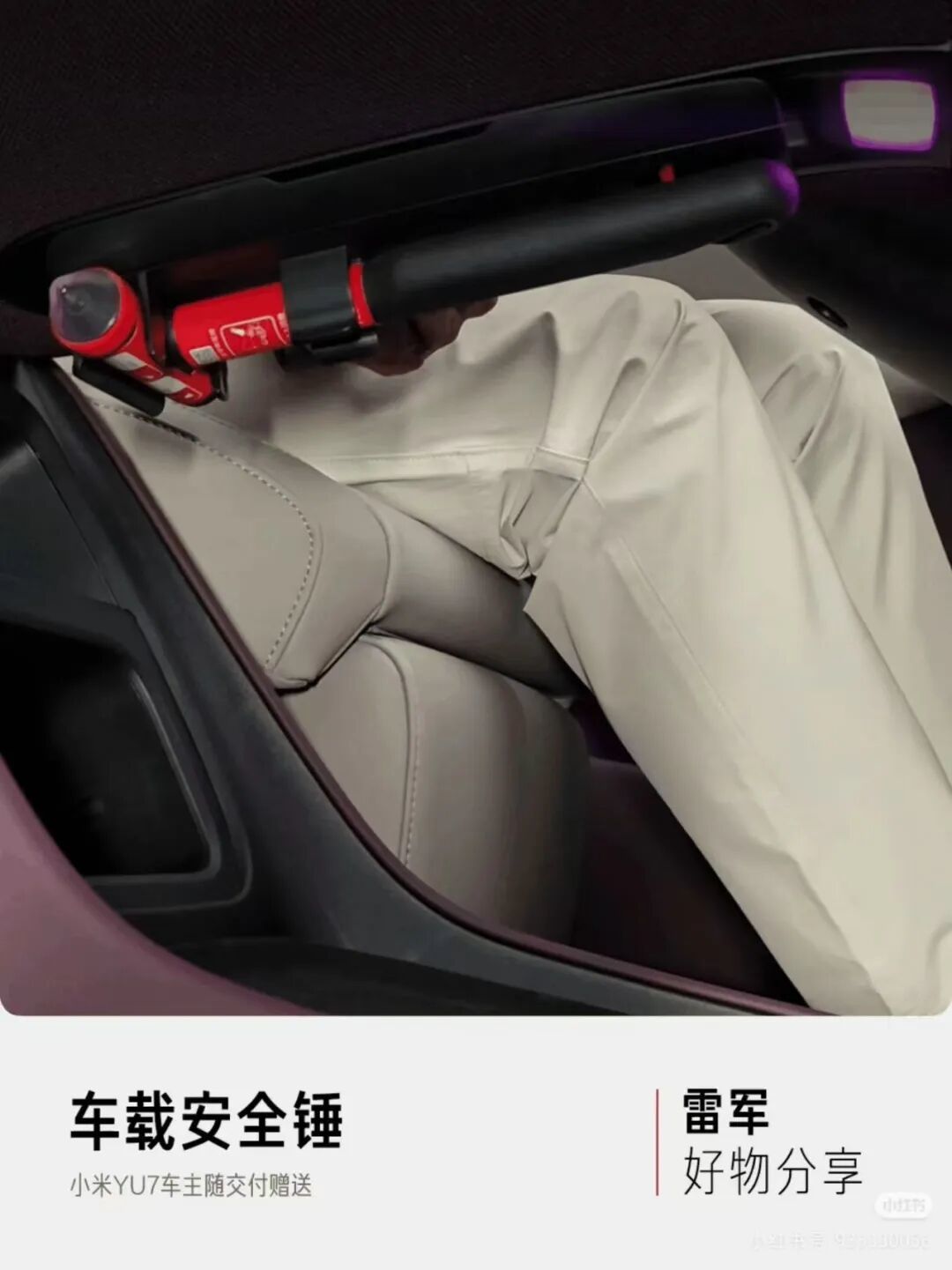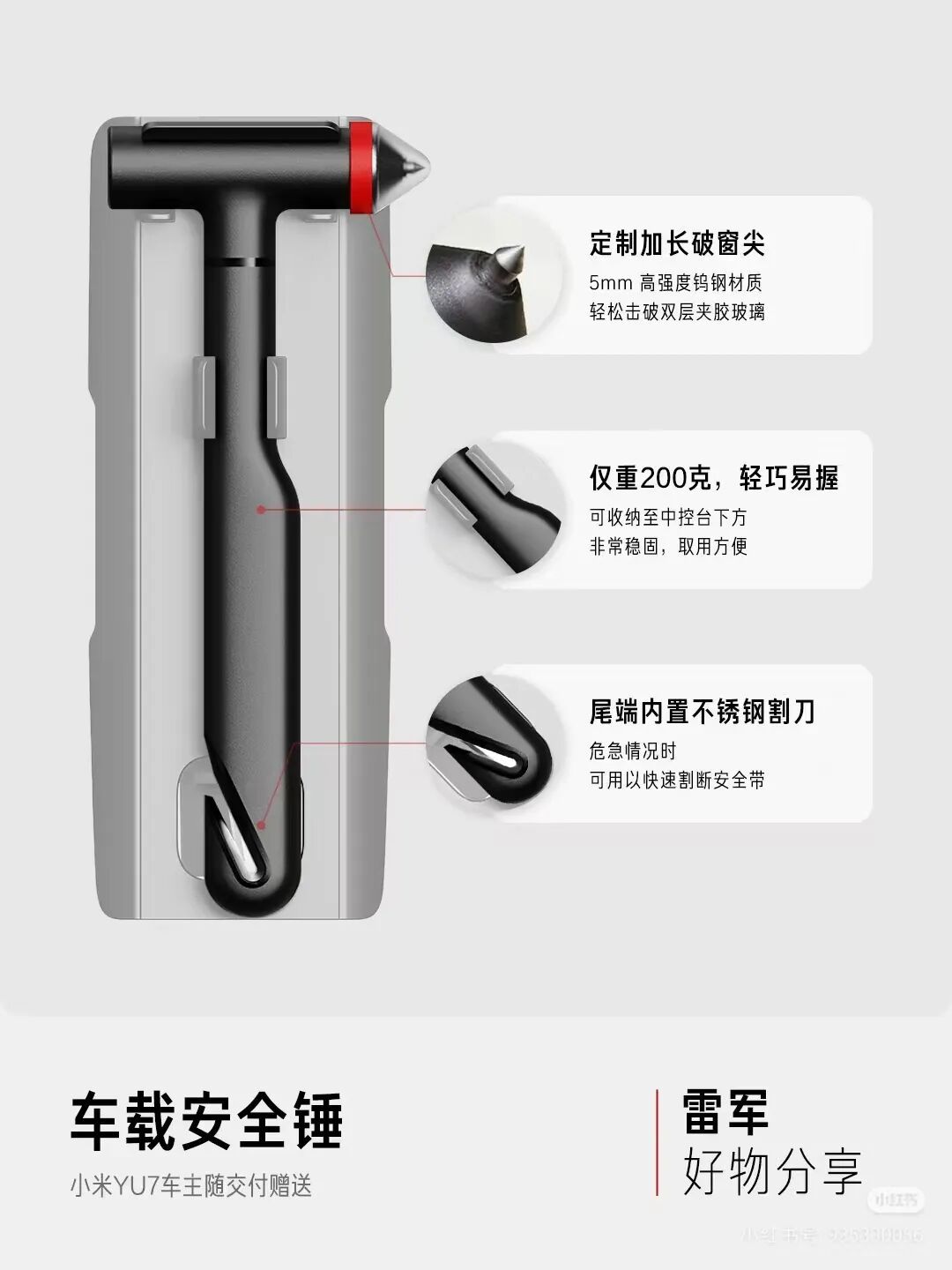 另外,雷軍曾特別介紹過YU7隨車附贈的破窗安全錘,該安全錘可安置在YU7中控扶手臺下方卡扣處。不過,目前YU7的安全錘暫未在小米官方渠道開售,僅隨車附贈。