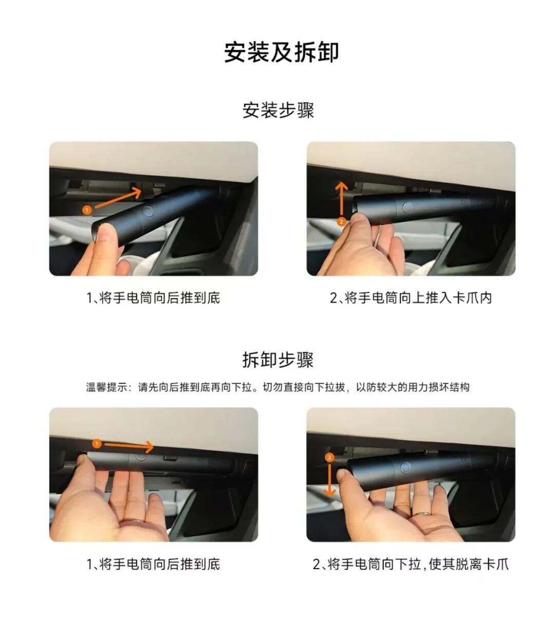 此外,在小米商城App以及小米汽車App中,官方也有明確的手電筒安裝和拆卸教程。由此看來,上述網(wǎng)友可能操作不規(guī)范,導(dǎo)致手電筒無法取出。