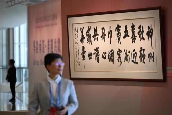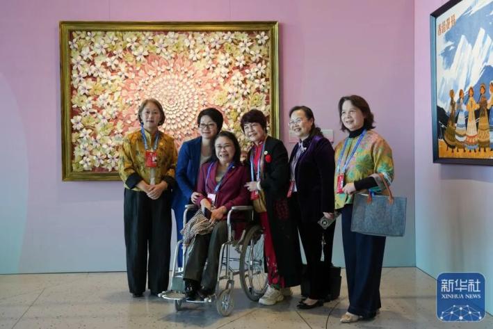 參會的張海迪等嘉賓在全球婦女峰會女性主題特展“華韻承芳·非遺共賞”上合影。新華社記者 胥冰潔 攝