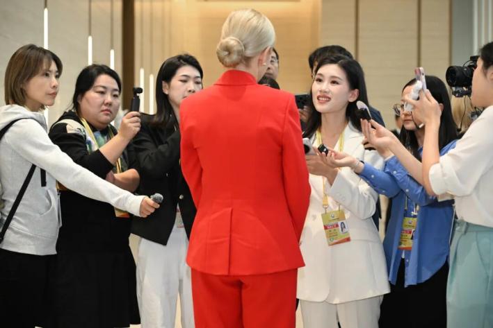 與會嘉賓在全球婦女峰會現(xiàn)場接受記者采訪。中國婦女報全媒體記者 楊睿 攝