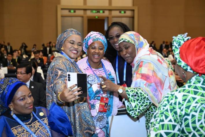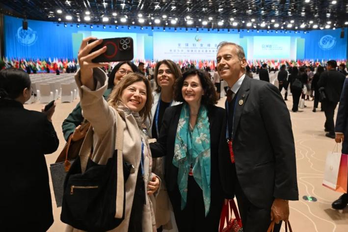 與會嘉賓在全球婦女峰會現(xiàn)場自拍留念。中國婦女報全媒體記者 楊睿 攝