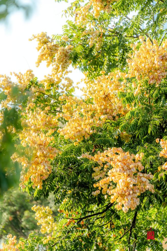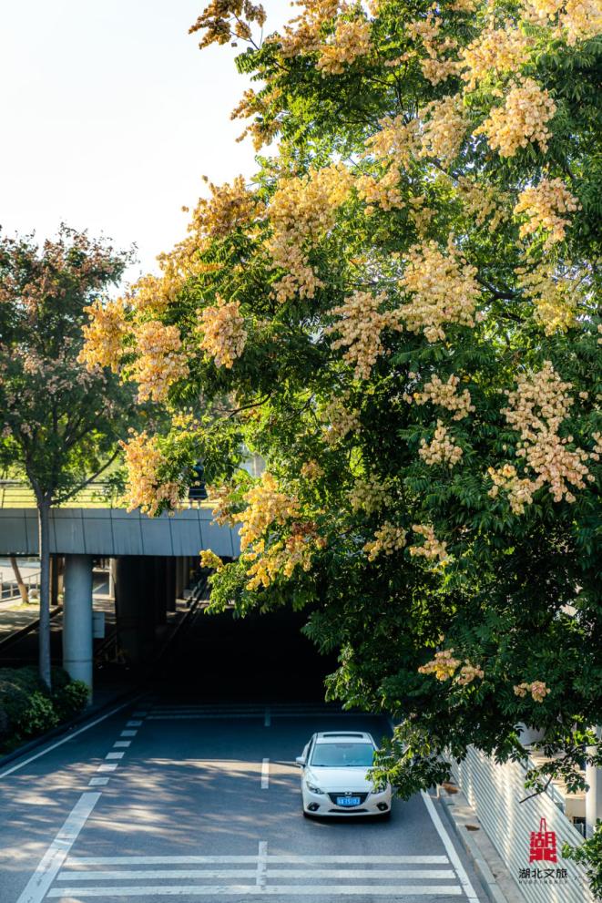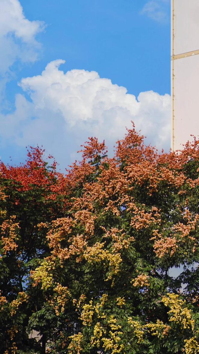 于是,在一棵樹(shù)上,你可以同時(shí)看到綠、黃、粉等多種顏色。尤其是那一簇簇果莢,像一團(tuán)團(tuán)輕霧,又像掛滿樹(shù)冠的淺色花簇,為繁忙的街道增添了一份輕快與浪漫。