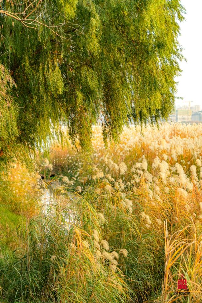 湖北的江河湖泊形成了密集的水網(wǎng),而蘆葦則是水岸的靈動(dòng)點(diǎn)綴。秋意漸濃時(shí),它們褪去綠衣,換上鵝黃與素白的衣裳,成片地立在水邊。