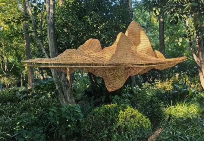 宋亮亮出生于1998年,大學(xué)學(xué)習(xí)設(shè)計學(xué)時接觸到竹編。他發(fā)現(xiàn)竹編器物很受大眾喜愛,但背后的工藝價值和藝術(shù)張力尚未完全釋放。于是,他全身心投入探索竹編更多元化的手工技藝和藝術(shù)表達,將現(xiàn)代設(shè)計語言融入傳統(tǒng)技藝,形成了自己的獨特風(fēng)格,創(chuàng)作了《云朵》《無用功》等代表作。本次藝術(shù)季參展的作品《無根山》,是他對竹編技藝的實踐探索,也是“道法自然”創(chuàng)作理念的體現(xiàn)。