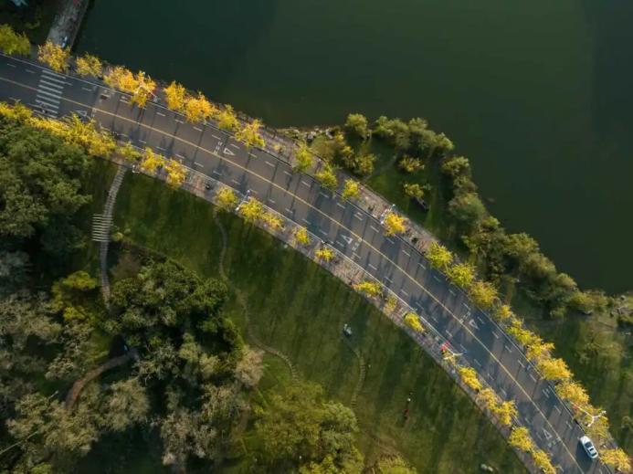 從圖書館到虎溪校園北門,銀杏大道是湖旁最靚麗的風(fēng)景線。不妨穿梭綠茵下,與重大共赴十月金秋之約。金黃到翠綠的漸變漫無邊際,將湖水也染得繽紛多彩。