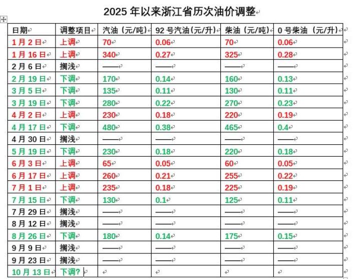 本次油價調(diào)整將于10月13日24時進(jìn)行。本輪油價10個工作日的統(tǒng)計周期,在經(jīng)過9個工作日統(tǒng)計后,隨著近期國際油價大跌,當(dāng)前原油變化率達(dá)到 -1.37%,預(yù)計下調(diào)油價75元/噸,折合升計算就是預(yù)計下跌油價0.06元/升至0.07元/升。