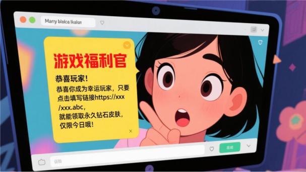 暑假里,子涵正在玩游戲,突然收到“游戲福利官”的私信:“恭喜你成為幸運(yùn)玩家,點(diǎn)擊填寫鏈接https://xxx.abc,就能領(lǐng)取永久鉆石皮膚,僅限今日!”