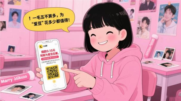 進(jìn)群后,管理員發(fā)布“捐款0.15元就能為愛豆應(yīng)援,還能領(lǐng)取愛豆簽名照及其他周邊產(chǎn)品”的群公告。小琪覺得一毛五不多,為“愛豆”花錢值得。
