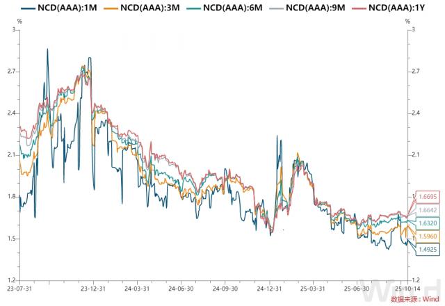 全國和主要股份制銀行一年期同業(yè)存單最新成交在1.67%附近,較上日有小幅上行。
