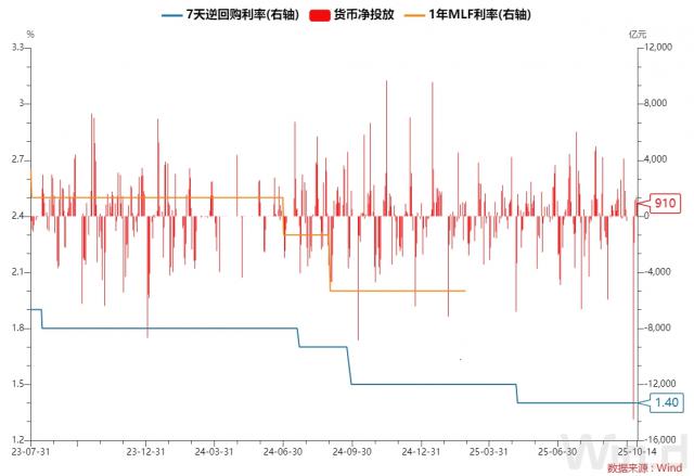 央行公告顯示,10月14日以固定利率、數(shù)量招標方式開展了910億元7天期逆回購操作,操作利率1.40%,投標量910億元,中標量910億元。據(jù)Wind數(shù)據(jù),當日無逆回購到期,所以單日凈投放910億元。