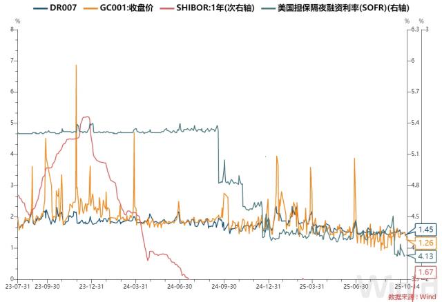 盡管當日有8000億元買斷式逆回購到期,但銀行間市場周二資金面依舊充盈。存款類機構(gòu)隔夜回購利率在1.31%低位附近徘徊,匿名點擊(X - repo)系統(tǒng)上,隔夜報價在1.3%仍有大量供給;非銀機構(gòu)以信用債為抵押借入隔夜,報價低至1.4%一線。