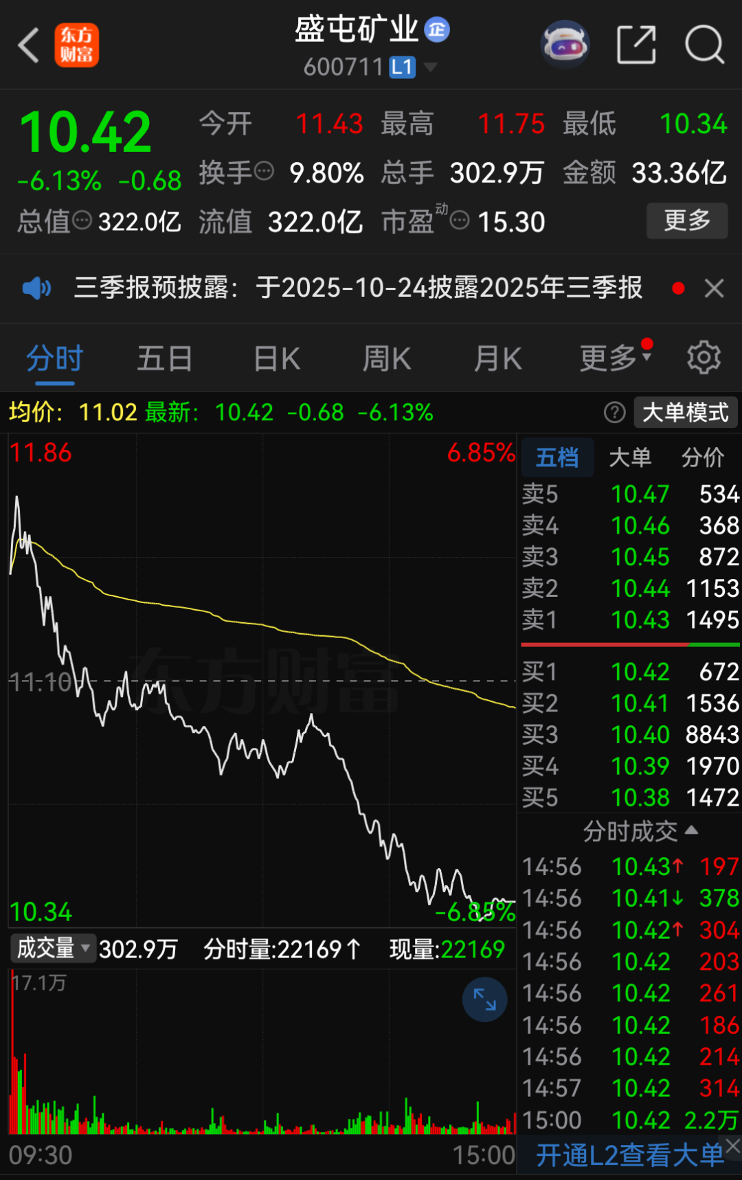 截至10月14日收盤,盛屯礦業(yè)股價報10.42元/股,跌幅6.13%,總市值322億元。