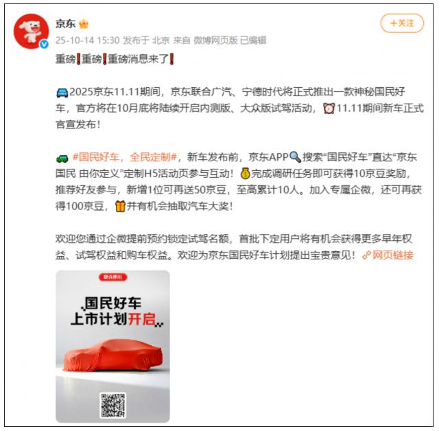 10月14日,京東微博宣布聯(lián)合廣汽、寧德時(shí)代將推出一款汽車,官方將在10月底陸續(xù)開(kāi)啟內(nèi)測(cè)版、大眾版試駕活動(dòng),11月11日期間新車正式官宣發(fā)布。(詳情點(diǎn)擊:新京報(bào))