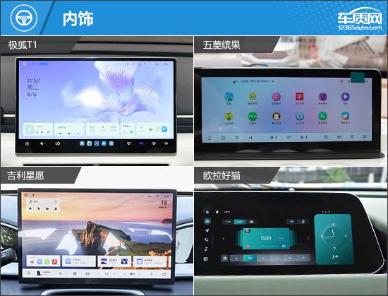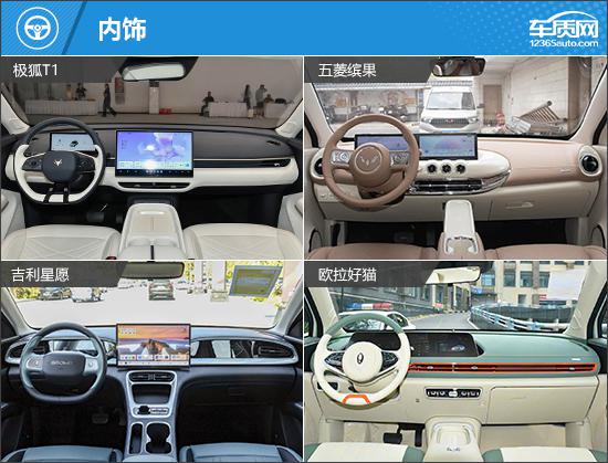 內(nèi)飾設(shè)計上,四款車大致分為兩類。極狐 T1 和吉利星愿采用對稱式中控臺布局,簡潔清爽。五菱繽果和歐拉好貓配備雙聯(lián)屏,淺色系配色搭配大量曲線和圓角元素,更具親和力。