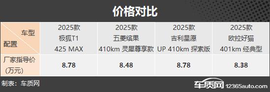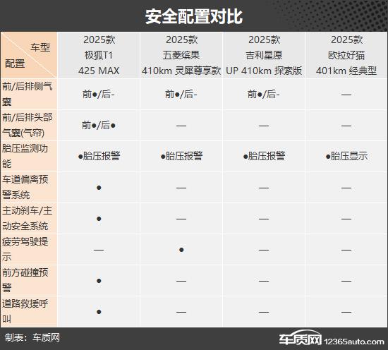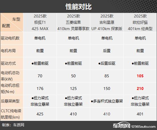 動力上,四款車都搭載單電機驅(qū)動系統(tǒng)。只有吉利星愿的電動機后置,其他三款前置。歐拉好貓的動力參數(shù)最出色,但 CLTC 純電續(xù)航里程最短。極狐 T1 的續(xù)航表現(xiàn)最佳,CLTC 純電續(xù)航里程達 425km??傮w而言,四款車的續(xù)航能力差距不大。