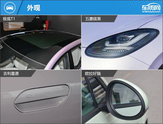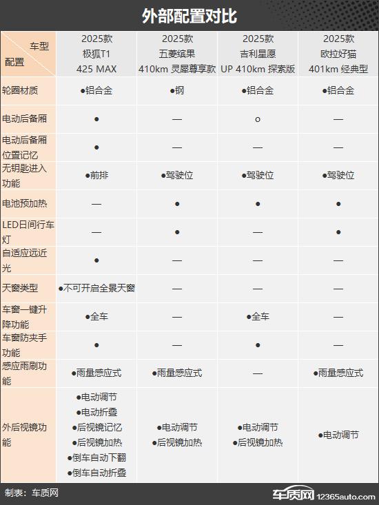 外部配置上,極狐 T1 表現(xiàn)最佳,相比競品優(yōu)勢明顯。另外三款車的配置有一定缺失,但對于入門級純電動小型車來說,也無可厚非。