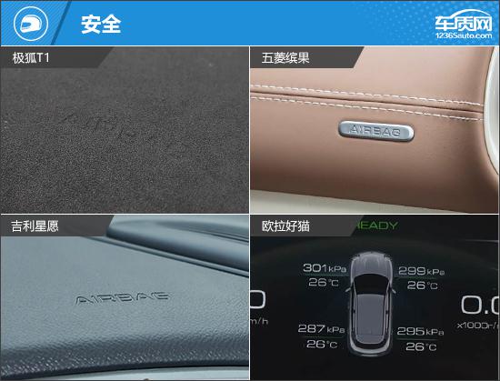 安全配置上,極狐 T1 最為完善。除了基礎(chǔ)被動安全配置,還搭載了車道偏離預警、主動剎車/主動安全系統(tǒng)和前方碰撞預警等主動安全配置。五菱繽果配備了疲勞駕駛提示,歐拉好貓擁有胎壓顯示功能,比其他三款車的胎壓監(jiān)測更直觀。