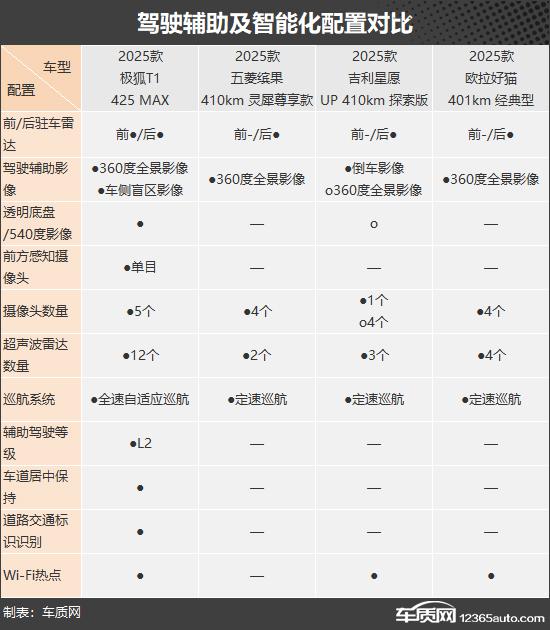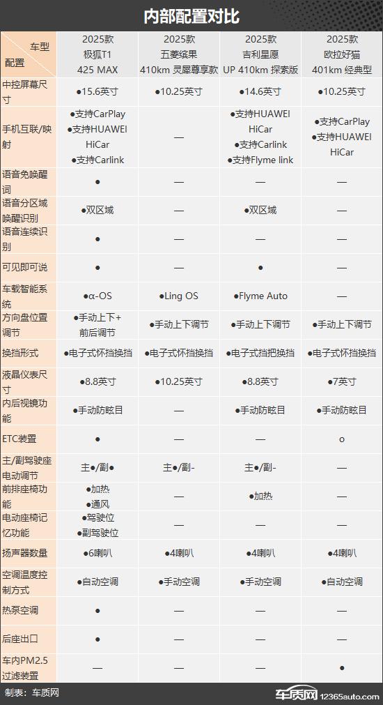 內(nèi)部配置方面,除了五菱繽果稍顯遜色,其他三款車競爭激烈。極狐 T1 整體表現(xiàn)更優(yōu),中控屏尺寸更大,還擁有語音免喚醒詞、語音連續(xù)識別、熱泵空調(diào)和后座出風口等獨特配置。即便配置相對較少的五菱繽果,也能滿足日常使用,物有所值。