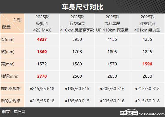 尺寸方面,極狐 T1 的車身長度、寬度和軸距都很突出,2770mm 的軸距在這個級別車型中非常少見。歐拉好貓車身高度最高,上窄下寬的設(shè)計讓它從后面看顯得很敦實。五菱繽果的輪轂尺寸只有 15 英寸,輪胎規(guī)格也一般;吉利星愿的輪轂尺寸為 16 英寸,而極狐 T1 和歐拉好貓配備的是 18 英寸輪轂。