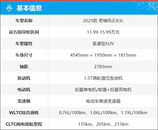 動(dòng)力方面,奇瑞風(fēng)云X3L搭載了由1.5T渦輪增壓發(fā)動(dòng)機(jī)和電動(dòng)機(jī)組成的“奇瑞鯤鵬黃金增程”系統(tǒng)。發(fā)動(dòng)機(jī)熱效率和油電轉(zhuǎn)化效率領(lǐng)先于同級(jí)產(chǎn)品。頂配車型提供雙電機(jī),電動(dòng)機(jī)總扭矩達(dá)到505N · m,其余車型均采用單電機(jī)。
